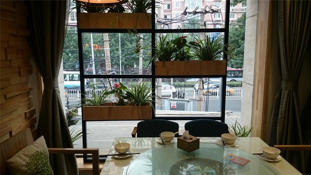 不像传统酒楼,二楼还是很多四人小桌,而不全是大圆桌。落地窗边摆满了盆栽,绿色和白色为主色的装修风格,让人看着很舒服。