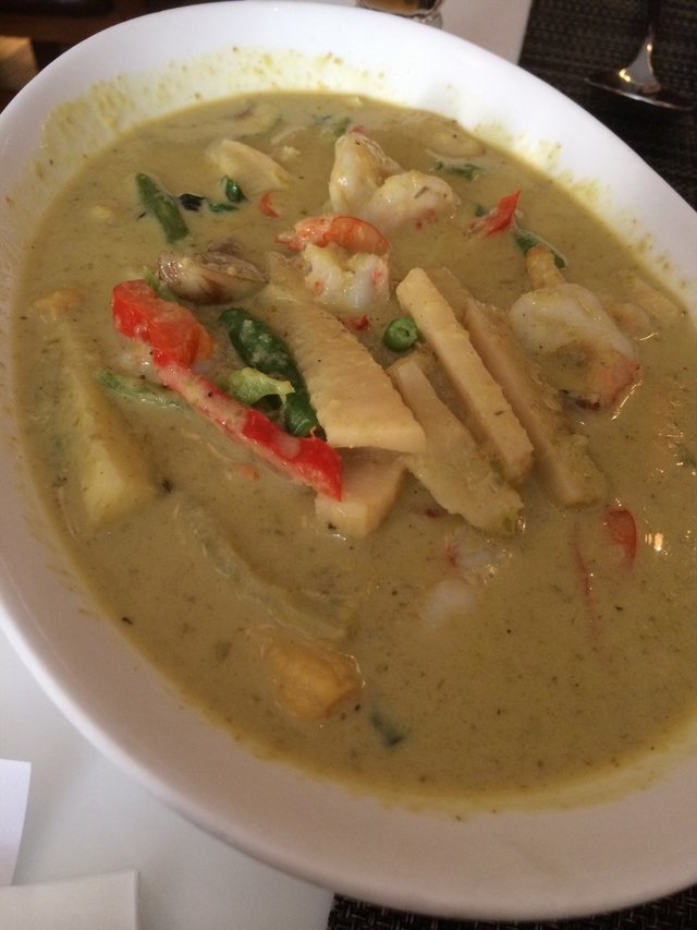 【绿咖喱虾仁】其实平日很少点绿咖喱,喜欢柔和的黄咖喱多一些。抛开个人主观因素,青柠家的绿咖喱做的很是正宗,咖喱汁里能明显吃出是由多种泰式香料打碎而成,并不是简单勾兑出的成品。拌上泰式香米,绿咖喱的辣能被中和一些,虾仁虽不多,但很嫩很juicy