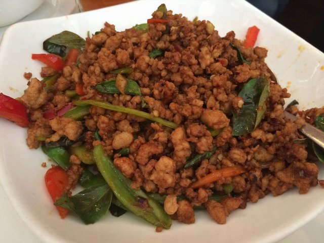 【紫苏辣椒炒猪肉末】原本被我不屑的一道菜,没想到非常好吃,且紫苏的融入带来了浓浓的泰式风情。猪肉的肥瘦配比精准,调味中清新不失回味