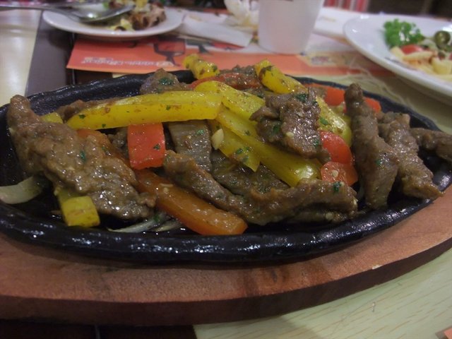 墨西哥铁板牛肉配薄饼,墨西哥叫法西塔。口感比较像我们的铁板牛柳了,还配了两色彩椒,倒是不辣,牛柳的味道不错,也比较软,卷在薄饼里或者直接当菜吃都是可以的。味道较好,推荐!