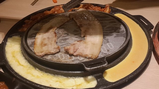 区别在烤炉边圆槽分三格:韩式泡菜、蒸蛋、芝士,