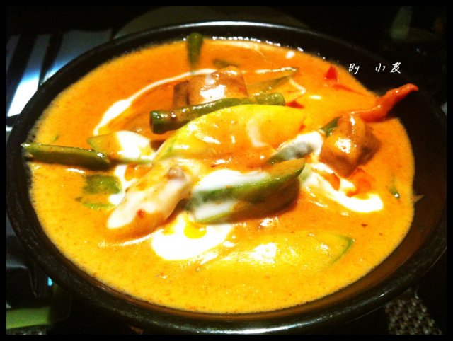 泰国菜里面每次蟹都是主打,但偏偏这个主打都超贵的,好吃是很好吃,盖子掀开来,一共四个,像是分好的一样,一人一个脚咬咬,后来还有两个蟹钳,靠自己的嘴巴是不行了,叫服务员将他夹碎,里面的肉质很鲜嫩,沾上他们的咖喱酱非常赞,他还配上香脆的面包,沾着咖喱酱吃,美味极了,不过我更喜欢配饭,所以我们一人一碗饭,哈哈。
