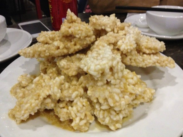 【蛋黄锅巴】真的是好久没吃到这种纯米做的锅巴啦,小时候爸妈单位大食堂里的大师傅会专门留给我这种烧饭大锅子里剩下的锅巴,勾起美好的回忆~~这里的锅巴还是稍微改良过的,里面掺了些大米爆出来的米花,油炸以后香香脆脆,淋上咸鸭蛋黄碾碎做的酱,好赞~
