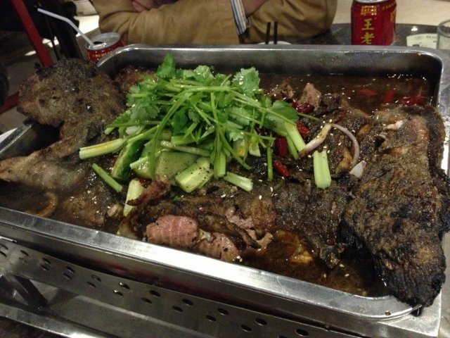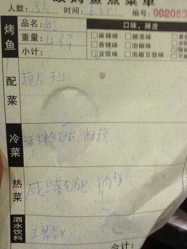 光线很幽暗,环境也走的是低调路线,超级拥挤的位置,我们被排在了居中,又一次是抱着包包吃饭! 上菜实在是实在是太慢了哇!点了2份凉菜,2份热菜,外加豆豉烤鱼一份,等到旁边后坐下的MM一桌已经开始大嚼烤鱼,我们还守着1份凉菜不舍得下筷~几番催促,只等来了另一份凉菜…