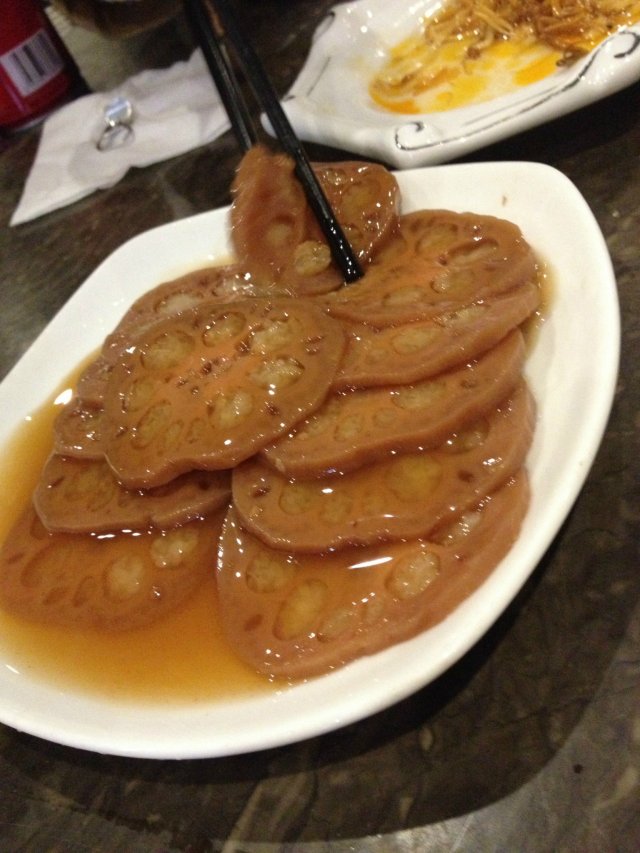 【糯米糖藕】比较好吃,淡淡的甜味,糯糯的,藕片切得不厚不薄,还带着脆脆的香,桂花一点点,就是要这种恰到好处的提味,就是分量不多哇~5个人,一人一片就所剩无几了。