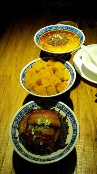 现在水平方楼上的餐饮生意都很好,除了外婆家要排队,其他的地方生意也是很好的,那天看不是很多人的就选择了小米,小米据说是和大蓉和一家的,是一个老板,但是总体风格是比较小众的,微信活动搞的不少,有扫微信送布丁的,还有些特价菜也吸引人,3元的麻婆豆腐,1元的有机泡菜,点了小米蒸三样,上来的造型蛮搞笑的三个小碗一字排开,放在一个一体的阶梯状的托架上面,有肉末蒸蛋,清水南瓜,梅干菜扣肉,点了这个菜等于点了三个菜,我们还店了抄手,干锅花菜,价格不贵,还在网上团了券,性价比超高。