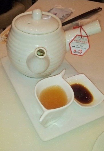 来他们家就是喝汤的,他们家喝汤的特色就是:喝汤像喝茶,一盅汤,一小个汤碗(比茶杯要小),和一小碟酱油(里面加了点点辣酱,微辣)是用来蘸汤渣的~LG说汤很甜,广东人说好吃都用甜表示...鸡是乌骨鸡不过竹丝是啥东东没明白~