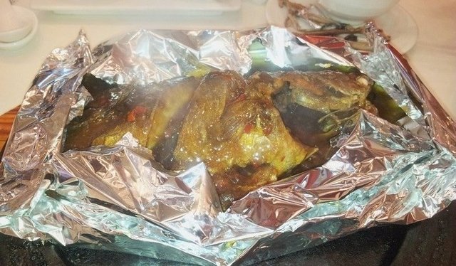 用锡纸包着上来的,切开后汤汁还在冒泡,味道不错哦,鱼肉挺嫩的,不过谈不上有啥惊艳的,还行~