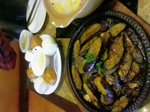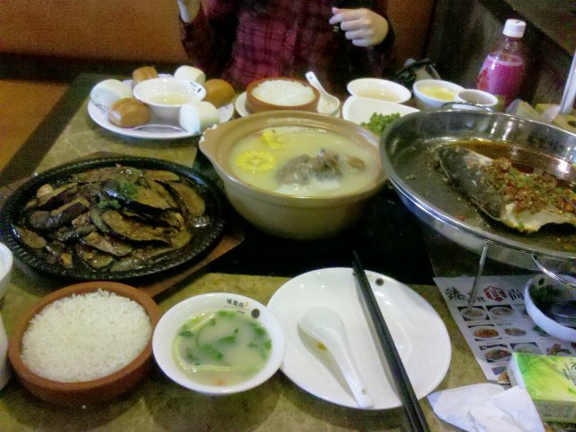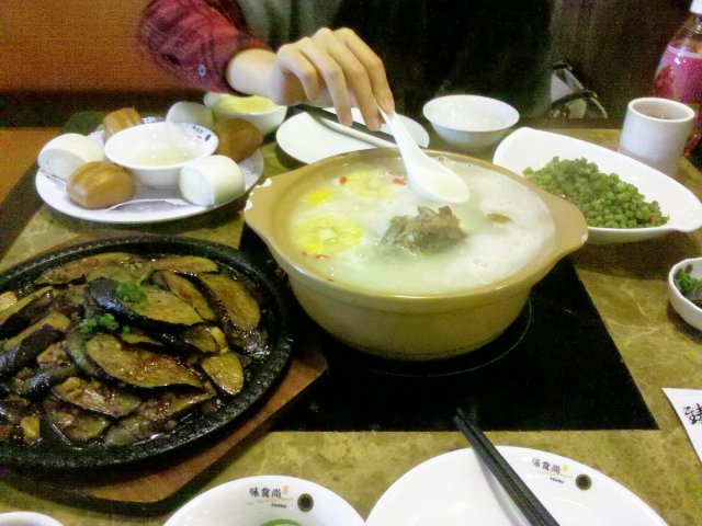 去西青的同事家玩,准备坐地铁再转轻轨回开发区,因为永旺就连着地铁站,所以索性就填饱了肚子再回去,西青这边的永旺吃的东西也挺多的,和开发区的永旺差不多,想着尝试下开发区那边没有的店,就来了它家了。这家店装修风格还蛮古色古香的,但是总体环境就很一般,去的时候人挺多的,有点吵。它家主要以砂锅汤为特色,点的玉米排骨汤,汤是乳白色的,那汤味道虽然不错,但是感觉可能鸡精调料什么的放的多吧,有点咸,汤倒是挺多,两人份的,四个人喝感觉都够,就是里面的骨头和配菜有点少。铁板茄子很好吃,煎的火候还不错,里面也挺入味的,唯一缺陷可能是太油了,吃多了会有些腻。食尚鱼头的卖相不咋地,很大铁盘子里装个丑了吧唧的鱼头,味道还行,但是不算特别出彩。
