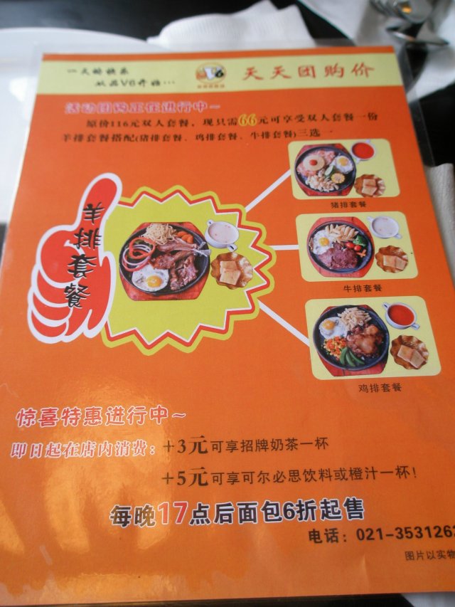 看了优惠后点了优惠套餐羊排+鸡排,两份只要六十六元钱哦!真的是超值啊!还另外要了一份T骨牛排,奶油蘑菇汤,桂圆红枣茶,咖啡和提拉米苏。