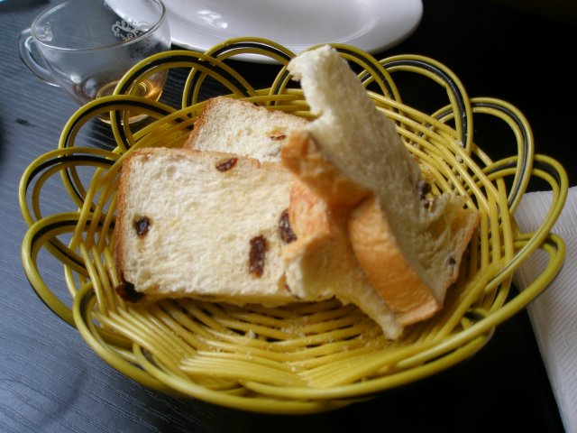 餐前的面包貌似是切片面包烘干的,还行!里面有葡萄干的,还蛮特别的。