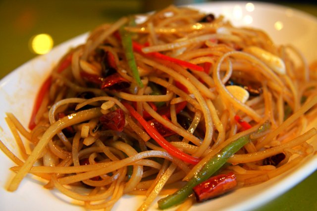 山西醋溜土豆丝,切成细长条,加入了些红辣椒丝,色泽浓郁,酸辣口感,很开胃,点上一份,消灭光