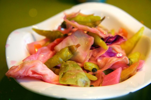 野菜小丸子,野菜裹了面粉油炸而成,旁边有小碟醋,好酸,不太适应,还是直接吃合适些