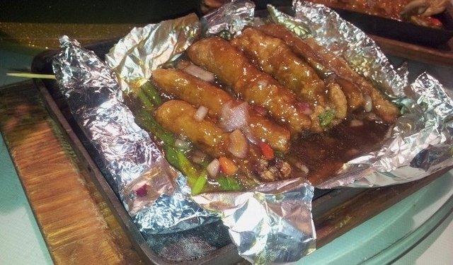 应该算是创意菜了吧,茄子裹着肉,沾着淀粉/面粉放油里炸,然后再放铁板烧的吧?纯属顺着口感个人猜测的做法喔~嘻嘻,还行...