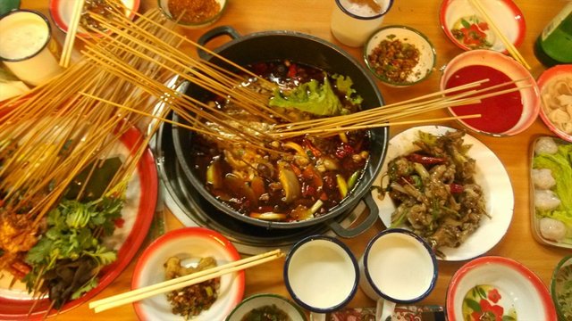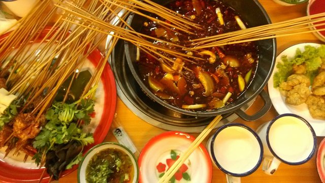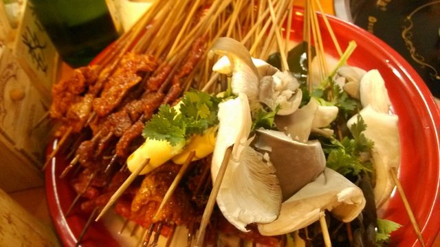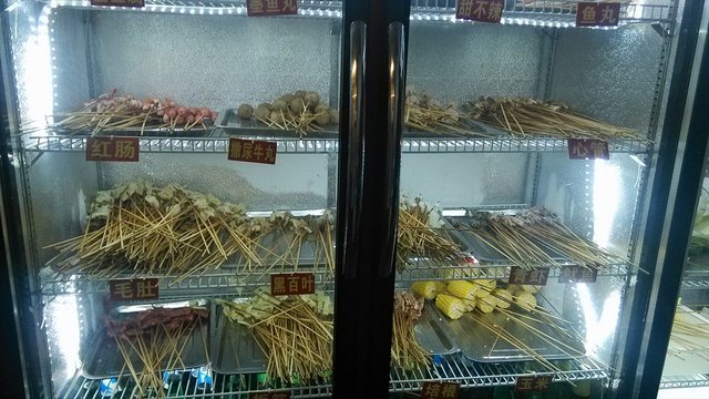 他家以串串为主,在冰柜里,自选的,大概几十种,我比较喜欢的有麻辣牛肉,泡椒牛肉,风干肠,香菜,白百叶等,除此之外还有鸡胗,排骨,鸡翅,青虾,蘑菇,土豆片等等很多种。