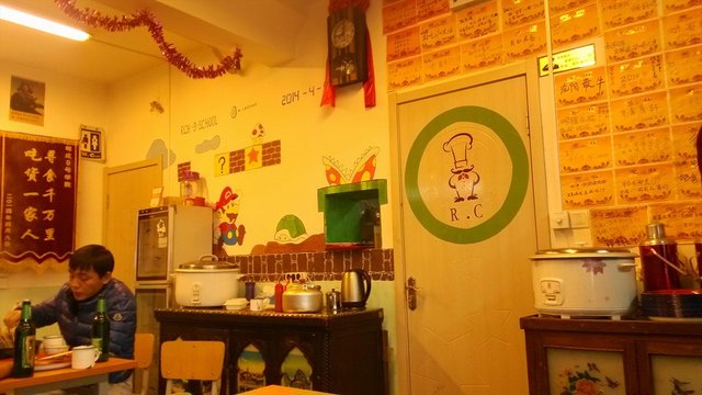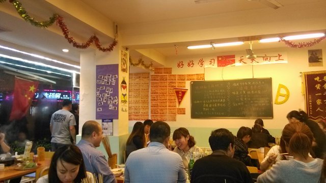 他家装修都是学校教室风格的,复古的老式挂钟,橱柜、墙上贴的各种奖状,最牛奖之类的,还有流动红旗。就餐的是课桌椅,10桌左右,地方相当小,人多时候吃的很憋屈。