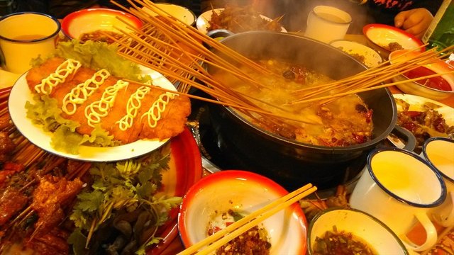 【串串】8角,锅里都是红油,各种调料,刚吃还可以,吃一回就会觉得辣,最喜欢还是牛肉香菜那个,肉很嫩,香菜甜甜的,很好吃,签子都是8角一个算,百叶好吃,就是太少了,一个上面煮出来一看就指甲大小。