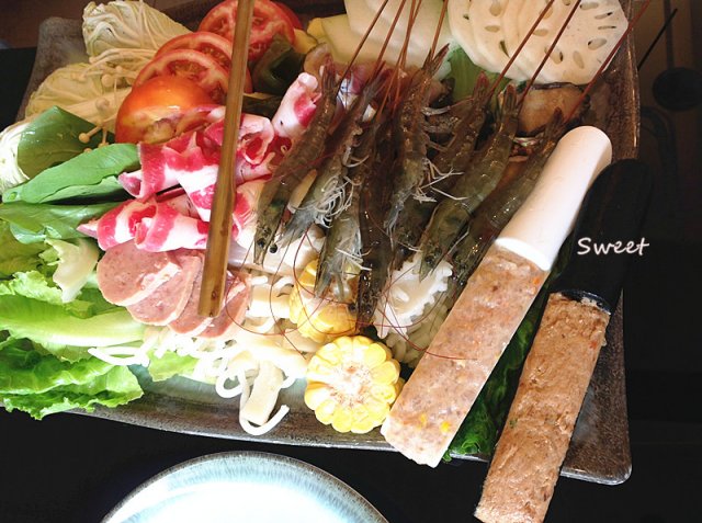拼盘内容有:虾、鲍鱼仔、鱿鱼花、滑类、蔬菜、肥牛、草鱼片、午餐肉、鱼丸、土豆粉、香豆腐、文蛤。
