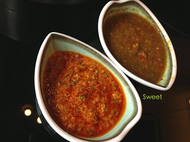 泰式蘸碟的酸爽味儿和小米辣的辣味突出,还有不少蒜泥,比较爽口。