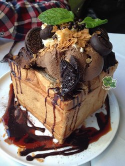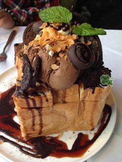 吐司真的是华丽丽的,看上去就很有幸福感,甜点果然是能让心情和味觉同时愉悦。味道么,因为配料的丰富,奶油、巧克力酱、冰淇淋、奥利奥饼干、烤过的面包...真的很不错。