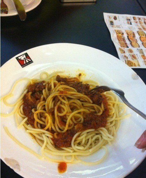 他家什么时候去,都有位子,而且中央楼上,逛街逛累了,正好去吃饭,坐坐,他家的披萨我觉得一般,料不算很多,吃起来饼皮也不算Q弹,不过价格便宜啊,基本都小几十这个和必胜客比就太有性价比了,海陆满溢披萨算是他们家比较不失水准的披萨,基本不会出错,东西要成热的吃,披萨不大,2个人,再点一份他家的肉酱意面,面条配合肉酱,口味搭配无可挑剔,价格也便宜,再点个小食拼盘,鸡翅啊,薯格,可以聊天消遣专用,总体说来他家性价比还是不错的,人不多清净,不会有人来人往的感觉比较不错