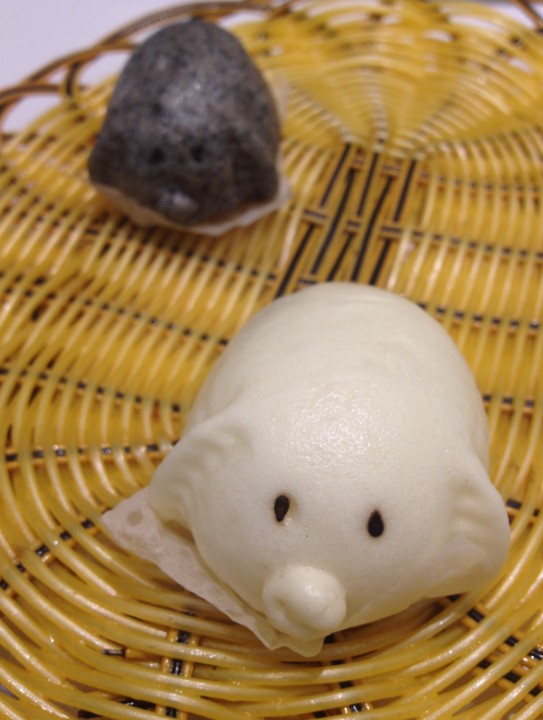 这端上来就招人爱的造型小包子,太可爱了。还有白色的和黑色的。不管白猪,黑猪好吃就是好猪。里面是莲蓉馅的,其实应该是猪肉馅的才对嘛。