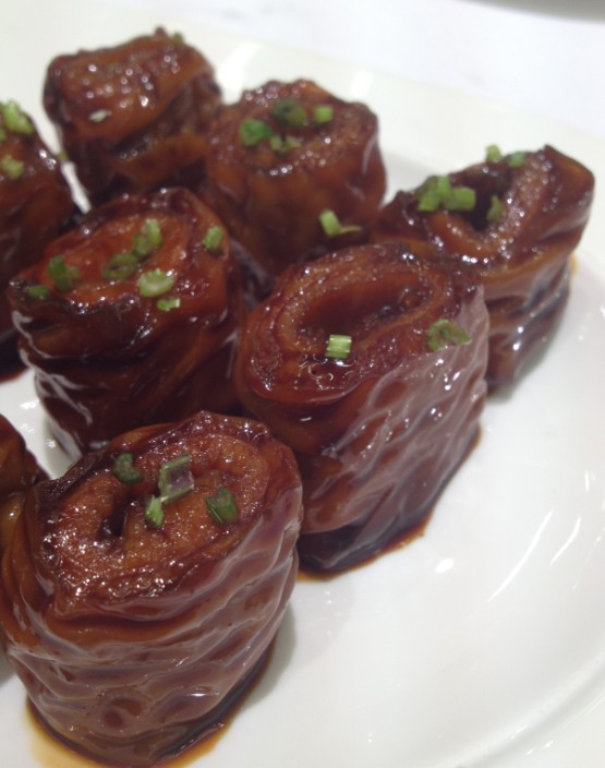 端上来就感觉好有卖相,不过也有点惧怕的感觉,因为这肥肠选的是最肥的那一截。一看就是浓油赤酱的酱香味道。吃这个东西我的经验是吃这个要一口闷,因为在大家面前把它咬断是很吃劲的事情,一定要选一个香菜最多的吃,因为香菜的小清新平衡了肥油的感觉啦。很有嚼头,真的。不过也很容易把人打闷,我的最大限度是三个。。。。因为实在太油了。。。。