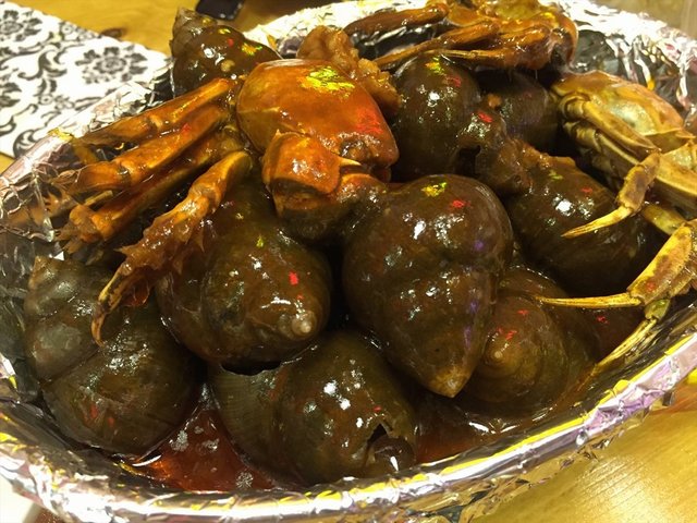 螺肉,螺肉和猪肉切细混合在一起的,味道很好,推荐,上面还有蟹呢。