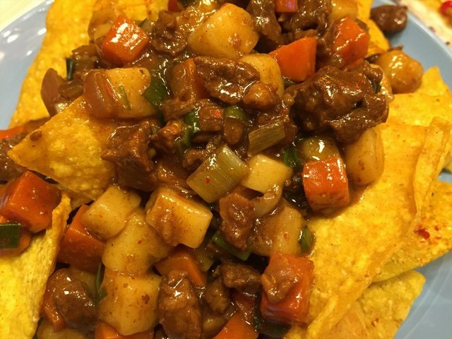 羊肉粒,垫了墨西哥式的开胃薯片,味道蛮好,还混了年糕和胡萝卜粒。