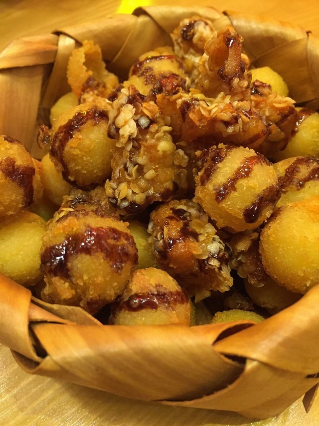 炸芋球鸡块,开胃菜,放在小篮子里。