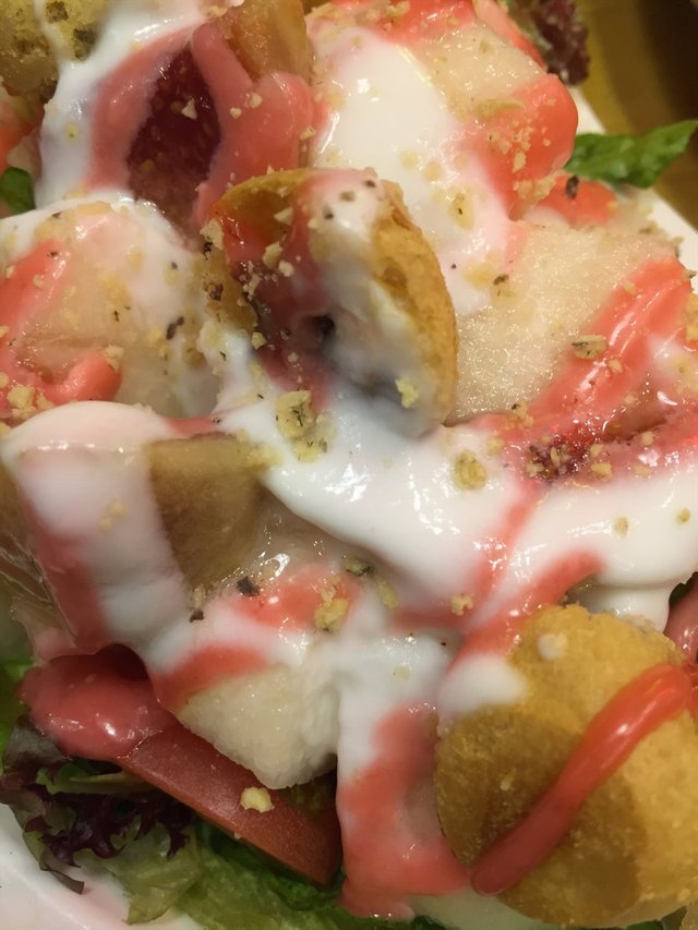 蔬菜色拉,上面浇了蛮多其它东西。