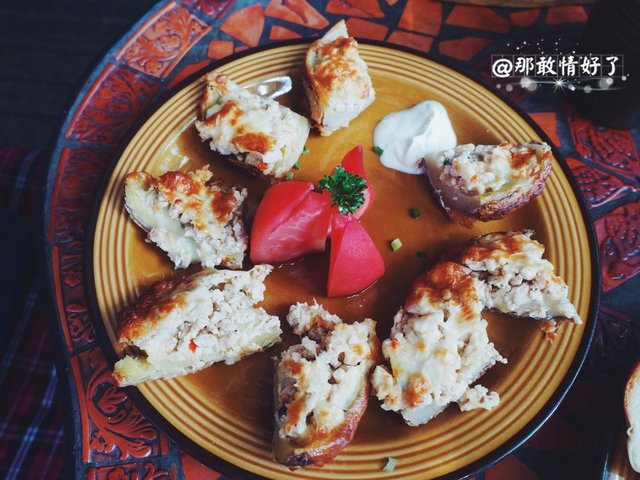 烤薯皮58块,要了鸡肉的,配酸奶油,8小块儿土豆上边满满的鸡肉粒,完全没味儿,番茄酱呀救星,但是撒上之后不就是番茄酱味儿了么。