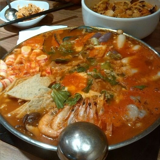 开业不久的店 好友知道他家有韩式火锅 特地拉我来探探 环境很干净整洁 店里主营韩式火锅 拌饭和小菜 正好点个69元双人的火锅 锅底选的是芝士年糕火锅和海鲜火锅 主食是辛拉面 各种年糕看起来像丸子一样 里面有白菜、土豆、香菇、豆芽等等配菜 火锅酸酸辣辣的很开胃 虽然里面荤的少得可怜 还送2杯蜂蜜柚子茶 好友说这么素不值这个价 不过看在味道还行 店里还有免费的畅饮不错的