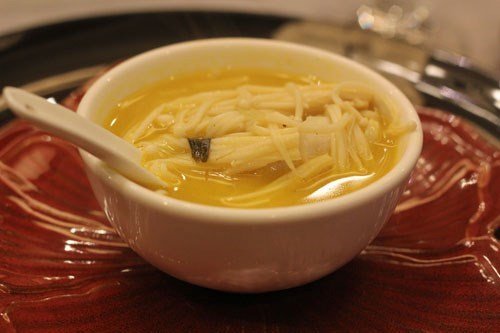 雕梅酸汤鲜鲈鱼,鱼汤简直就是贵州酸汤鱼和泰国冬阴功汤的MIX版本。这道汤的酸来自用花雕酒腌制过的青梅,酸、辣、鲜、香完美平衡。香茅、雕梅、树番茄等食材把鱼的鲜味吊了出来,同时把腥味完全去除了。吸饱鱼汤的爽滑金针菇不但增添了汤头的鲜味,更是增加了与鱼肉之的口感的层次与对比。