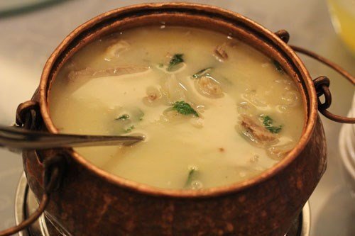 铜锅老火牛扒呼与大酥牛肉比起来,这道菜多了几分小清新的感觉,乳白色的汤头味道丰常浓郁,可能是加上了牛筋汤汁喝起来很滑润。薄荷叶的加入让这道菜有点峰回路转的感觉,清淡中有疑似清凉,洁白的原料中有一丝微绿。配上大蒜末、辣椒末和花椒粉的味碟,可以根据自己的喜欢拌食牛肉和喝汤。
