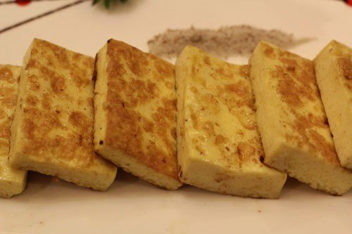 脆皮自制豆腐,吃起来有点像是日本豆腐的口感,制作起来是相对简单的,豆腐入锅蒸后切开,滚一层淀粉,放入煎锅中煎一下,煎至豆腐的表皮呈虎皮状,放入盘中就好了。