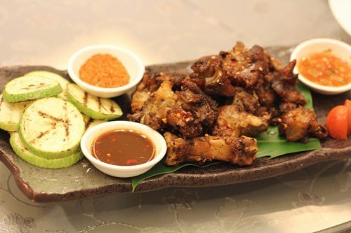 炭烤猪蹄拼小瓜,烤猪蹄、烤西葫芦的搭配从色彩上让食客感觉为之一振,猪蹄的表皮油脂被烤出来了,让枣红的色泽更加诱人,油脂的香气扑面而来,外皮焦脆的口感充分发挥出了烤制美食的特点。烤好西葫芦外皮浅绿,内瓤洁白,加上烤制时留下的深红色和自身的绵软口感,与烤猪蹄的色、香、味、型、质形成对比。