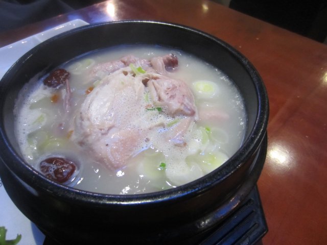 最吸引我的是人参鸡汤。 以前看韩剧,就对这个鸡汤心驰神往了。 汤上来了。 是整个童子鸡吧。 里面塞了糯米,栗子,小根的人参,枸杞。 糯米软糯,栗子鲜甜。 再品口汤,虽然汤色还不是奶白的,但是也是很鲜美的。 想着里面有人参,枸杞,红枣,就不尽多喝了好几口鸡汤了。
