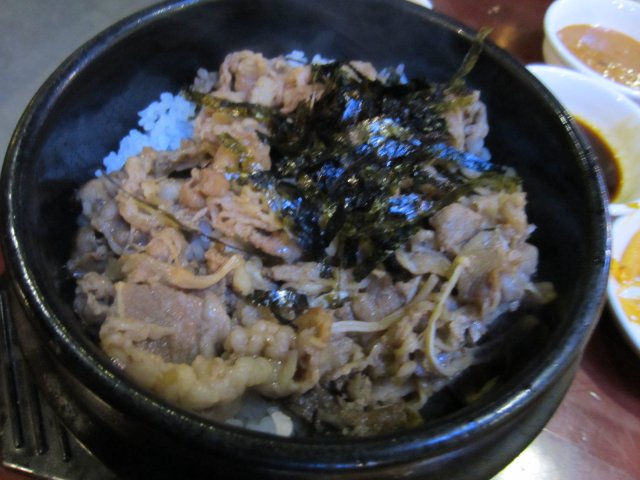 肥牛石锅拌饭。这个也味道不错。里面是很多片肥牛和海苔。 肉是蛮多了。 海苔也很香。 就是加热的火候不够, 没有金色的饭底。 不过胜在肉多,还是很超值的。