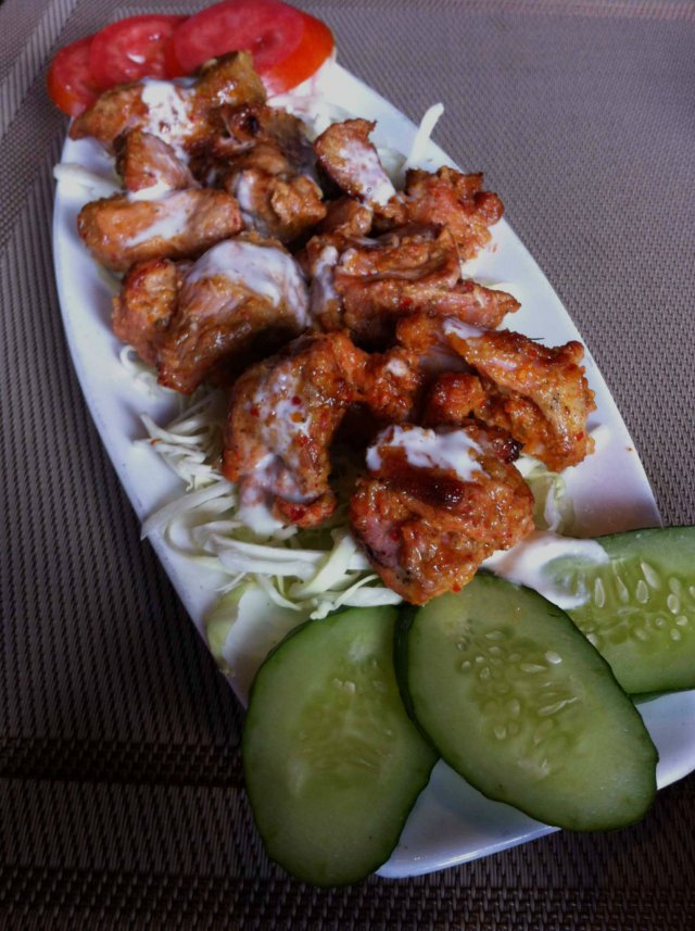 本想点烤虾,价格一样都是68元,服务员MM好心的告诉我大虾量非常少,羊肉串点击率比较高,量也大。说是羊肉串,上桌时肉都从钳子上取下来直接摆在盘中,淋了奶油汁,比较有特色,肉烤的很嫩,微辣。