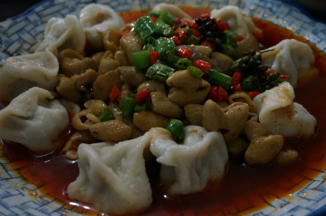 【肥肠水饺】里面的肥肠还算比较入味,嚼着比较香,但是水饺皮简直没有了口感,棉得很,比较一般~~~