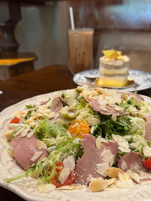 。沙律份量都算大碟,撒左好多芝士粉,沙律菜新鮮,牛肉薄片唔韌