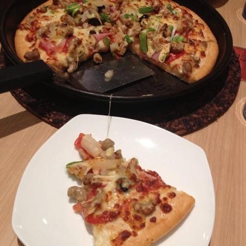 必胜客是我比较喜欢的洋快餐之一,近年来它家在很多热闹的地方都开了店面,生意非常不错.这家店开在春申路上的春申大厦内,这里交通非常方便.这家店面不大,但是店内环境整洁,服务员也很热情.这家店离单位比较近,所以经常会来这里吃午饭.个人比较喜欢它家的海鲜匹萨,它家的匹萨饼底烤的金黄,入口略带脆感觉,匹萨上面洒满了新鲜的海鲜,里面有虾仁,鱿鱼和蟹肉棒,入口虾仁有弹性,蟹肉棒鲜嫩可口,搭配上新鲜爽脆的青椒后味道更美味好吃.它家的价格也不贵,属于非常不错的选择.
