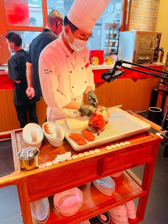 師傅現場即時切出鴨肉,刀工了得片片色澤紅亮的鴨皮,令人唾涏三尺!