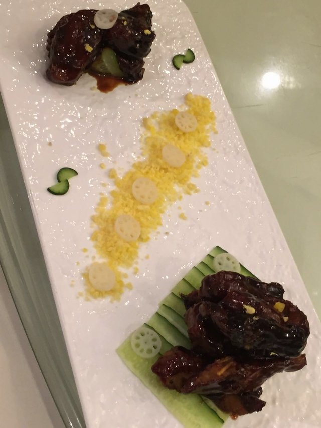 鳕鱼马兰头 一般外面吃都是香干马兰头 这边做了些改良 在马兰头上加了鳕鱼粒 居然还用了根POCKY当点缀 既丰富了口感又增强了美感 作为本帮常规冷菜 很清爽
