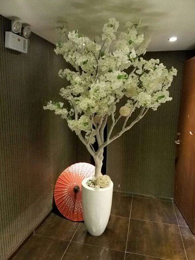 从一楼走上去,二楼倒是蛮大的,各处细节都彰显日本特色风情,角落里放着挺唯美的樱花树,还挂着各种日式和服仕女图。