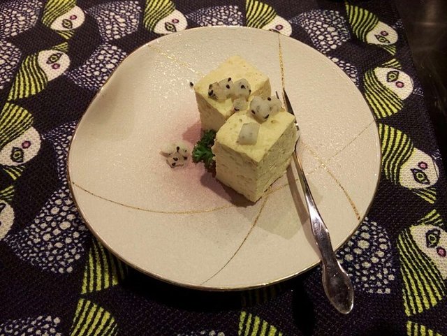 这边只要消费就送特色豆腐一份,用的是蜂窝老式豆腐,用很精美的磨砂陶瓷盘盛着【PS:很喜欢这儿的餐具,带着淡淡桃红的色泽】特色豆腐的口味有点类似传统的芝士豆腐,不过做了改良,用得是花生酱,口感相对来说要比芝士更厚实一点,上面放着几小粒火龙果来点缀。
