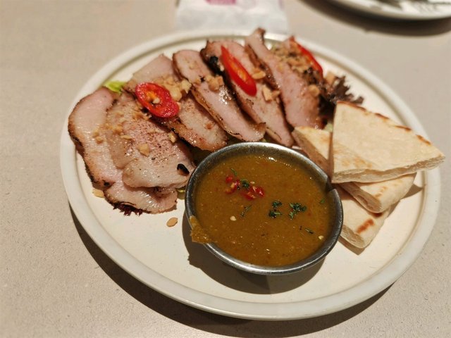 先黎個前菜,豬頸肉切得厚薄均勻,色水靚到流口水~入口嫩滑,熏香淡淡嘅唔會搶戲,但個蘸醬就 “殺食”!酸甜中帶少少辣,不過個人覺得辣度可以再減少啲(可能我唔太食得辣)。配埋烤餅一齊食,層次感豐富,正!