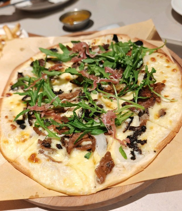 成晚最驚喜!薄餅底脆到 “喀喀聲”,拎起黎都唔會軟塌塌~鋪滿黑松露醬、蘑菇同風乾火腿,芝士一拉絲就知用料夠靚!咬落去鹹香濃郁,芝麻菜又帶黎清新感,完全唔會膩,連小朋友都話 “好好味”!