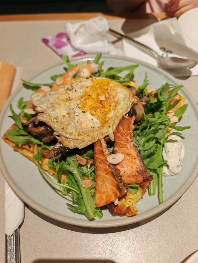 呢個必點!芝麻菜鋪底,上面嘅三文魚煎到金黃,外脆內嫩,一刀切落去肉汁都流出黎~太陽蛋仲係流心狀態,戳破後撈勻成碟沙拉,creamy 到不得了!最驚喜係底層有蛋餅,雖然份量唔多,但女仔食就剛剛好,健康又飽肚~